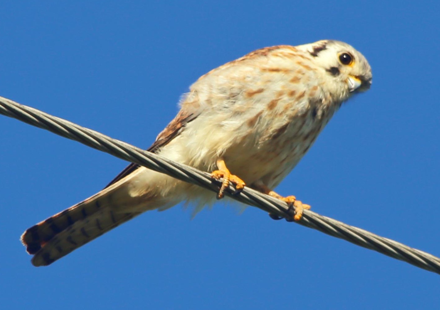 I figured out that she was an American Kestrel. Also called “sparrow hawk,” they are North America’s smallest and most colorful falcons. The heavy dark brown stripes across the tail of this one showed she was a female (I first thought she was a male).