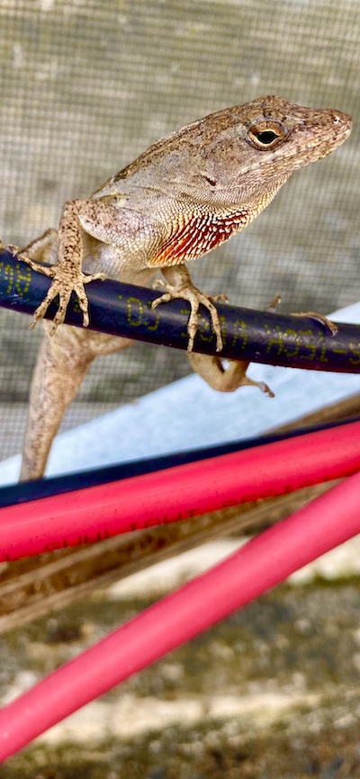 To make a long story short, Brownie was doing just fine–in the end. My tears over Brownie’s demise would have seemed an exaggeration to outside observers anyway. Brownie is a five-inch-long (counting his tail), very common lizard, and brown, as the name I gave him implies. He belongs to the dominant lizard species on our property here on the edge of the Everglades. They are called brown anoles (which I learned after I had named him Brownie) and found their way to South Florida from Cuba and other Caribbean islands. There are thousands of Brownie brothers and sisters teeming everywhere here. They are part of the landscape.